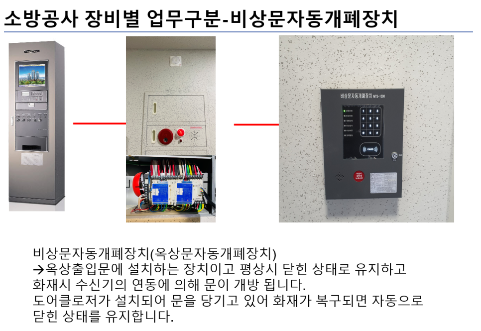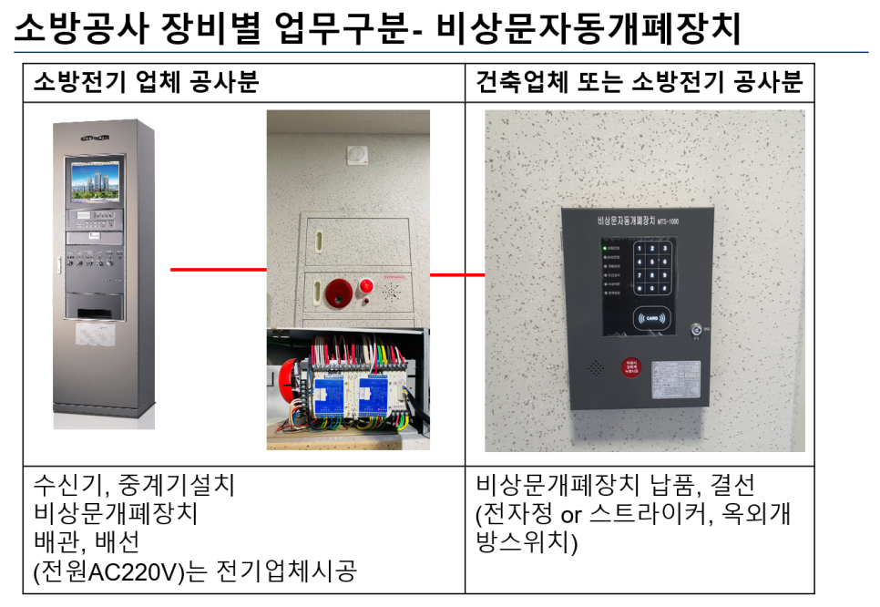 만약 자동폐쇄장치, 창문형폐쇄장치를 문을 담당하는 건축에서 시공하였으면 비상문자동개폐장치도 건축에서 시공합니다.